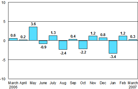 According to Statistics Finland, seasonally adjusted industrial output was 0.3 per cent higher in March 2007 than in February.