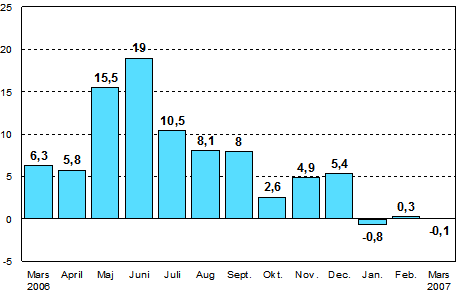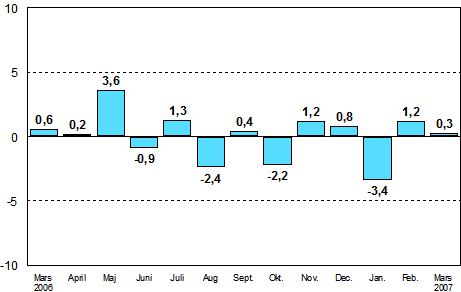 I mars 2007 var den säsongrensade industriproduktionen enligt Statistikcentralen 0,3 procent större än i februari.