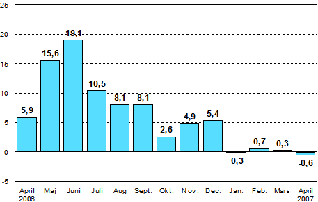 I april 2007 var den säsongrensade industriproduktionen enligt Statistikcentralen 0,6 procent mindre än i april 2006. Under januari-april var industriproduktionen på samma nivå som under motsvarande tidpunkt i fjol.
