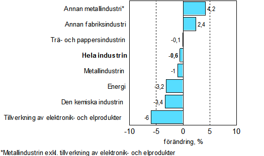 Produktionen sjönk i april inom flera huvudnäringsgrenar. Mest sjönk tillverkningen av elektronik och elprodukter, med 6 procent. Inom den kemiska industrin minskade produktionen med drygt 3 procent. Produktionen gick upp i april inom annan metallindustri, dvs. med drygt 4 procent och inom annan fabriksindustri, dvs. med drygt 2 procent från året innan.