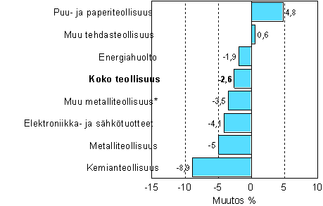 Tuotanto laski toukokuussa useilla päätoimialoilla. Kemianteollisuudessa laskua kertyi 8,9 prosenttia. Metalliteollisuudessa tuotanto väheni 5 prosenttia ja elektroniikka- ja sähkötuotteiden osalta 4,1 prosenttia. Kasvualoja olivat toukokuussa puu- ja paperiteollisuus, jossa tuotanto kasvoi 4,8 prosenttia sekä muu tehdasteollisuus, jossa kasvua kertyi 0,6 prosenttia vuotta aiempaan verrattuna.