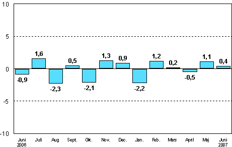 I juni 2007 var den säsongrensade industriproduktionen enligt Statistikcentralen 0,4 procent större än i maj.