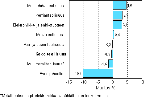 Teollisuustuotanto kasvoi heinäkuussa 2007 Tilastokeskuksen ennakkotietojen mukaan useilla päätoimialoilla verrattuna edelliseen vuoteen. Tehdasteollisuuden tuotanto oli 1,4 prosenttia viime vuotta suurempi. Toimialoista kasvoivat eniten muu tehdasteollisuus, kemianteollisuus sekä elektroniikka- ja sähkötuotteiden valmistus. Koko teollisuustuotanto oli kuitenkin heinäkuussa 0,5 prosenttia pienempi kuin viime vuonna, koska energiahuollon toimialalla tuotanto väheni runsaat 10 prosenttia. Sateinen heinäkuu pudotti turvetuotantoa vajaat 80 prosenttia.