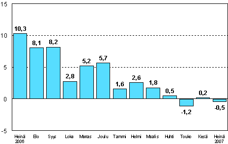 - Teollisuustuotannon kausitasoitettu muutosprosentti kesäkuu 2007 / heinäkuu 2007 (31.8.2007)