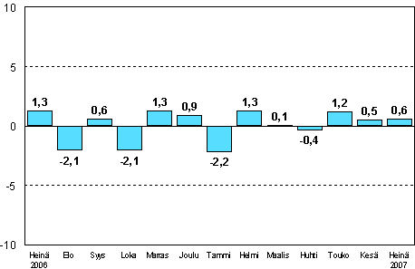 Teollisuuden kausitasoitettu tuotanto oli Tilastokeskuksen mukaan vuoden 2007 heinäkuussa 0,6 prosenttia suurempi kuin kesäkuussa.