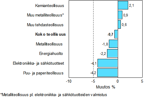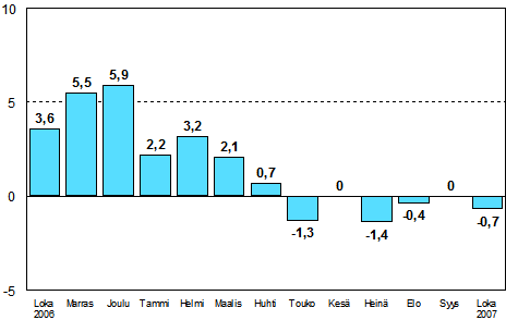 Teollisuuden kausitasoitettu tuotanto oli Tilastokeskuksen mukaan vuoden 2007 lokakuussa 0,7 prosenttia pienempi kuin vuotta aikaisemmin. Toimialoista kasvoivat eniten kemianteollisuus, muu tehdasteollisuus sekä muu metalliteollisuus. Puu- ja paperiteollisuuden tuotanto väheni runsaat 4 prosenttia. Tammi-lokakuussa teollisuustuotanto kasvoi 0,4 prosenttia viime vuoden vastaavasta ajankohdasta.