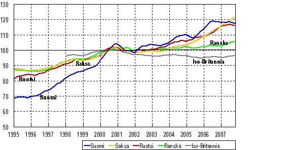 Teollisuustuotannon trendi TOL C,D,E, Suomi, Saksa, Ruotsi, Ranska ja Iso-Britannia 1995 - 2007, 2000=100