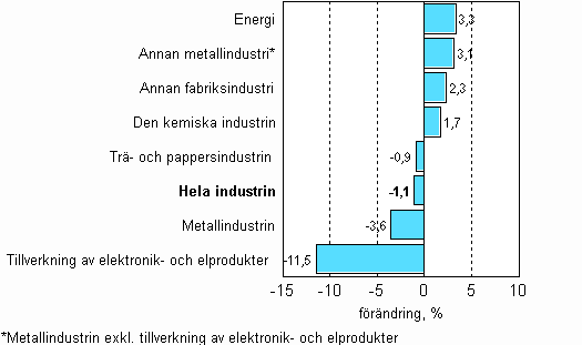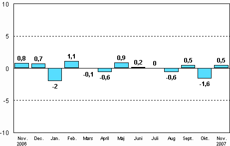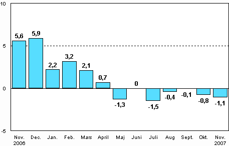 I november 2007 var den säsongrensade industriproduktionen enligt Statistikcentralen 1,1 procent mindre än året innan. Av näringsgrenarna var ökningen störst inom energiförsörjning, övrig metallindustri och övrig fabriksindustri. Produktionen minskade mest inom tillverkning av elektronik och elprodukter, med drygt 11 procent. Produktionen inom trä- och pappersindustrin minskade med något under en procent. Under januari-november ökade industriproduktionen med 0,2 procent jämfört med motsvarande period året innan.
