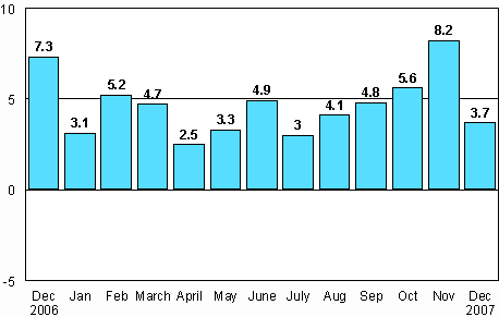 Seasonally adjusted change in industrial output by industry 12/2006-12/2007, %