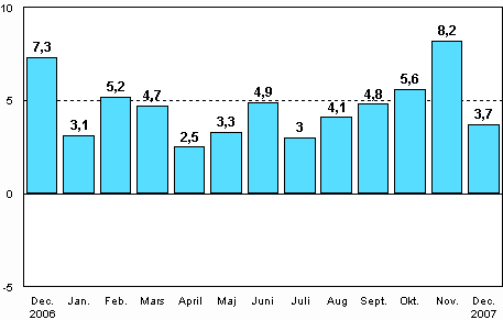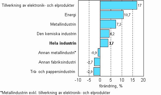 I december 2007 var den säsongrensade industriproduktionen enligt Statistikcentralen 3,7 procent större än året innan. Produktionen ökade mest inom tillverkning av elektronik och elprodukter, med 17 procent. Andra näringsgrenar som ökade var energiförsörjningen och den kemiska industrin. Mest minskade produktionen inom trä- och pappersindustrin, med något under 3 procent. Enligt de preliminära uppgifterna ökade industriproduktionen år 2007 med 4,6 procent.