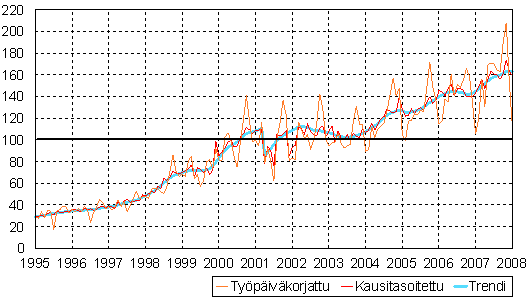 teollisuustuotannon volyymi-indeksi 1995 - 2008 tammikuu,