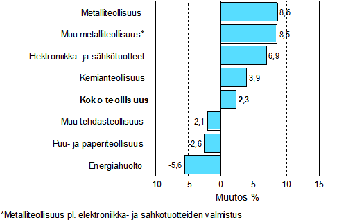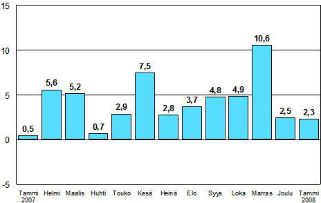 Teollisuuden työpäiväkorjattu tuotanto oli Tilastokeskuksen mukaan vuoden 2008 tammikuussa 2,3 prosenttia suurempi kuin vuotta aikaisemmin. Metalliteollisuuden tuotanto kasvoi tammikuussa eniten. Sen tuotanto kasvoi 8,6 prosenttia. Kemianteollisuuden tuotanto kasvoi tammikuussa 3,9 prosenttia. Eniten tuotanto väheni energiahuollossa, 5,6 prosenttia. Puu- ja paperiteollisuuden tuotanto oli tammikuussa 2,6 prosenttia alempi kuin vuotta aikaisemmin. Muun tehdasteollisuuden tuotanto laski 2,1 prosenttia.