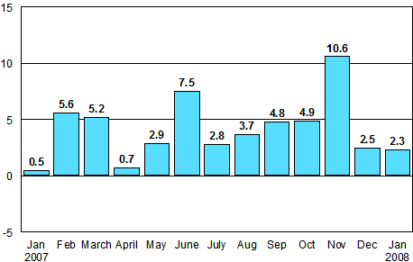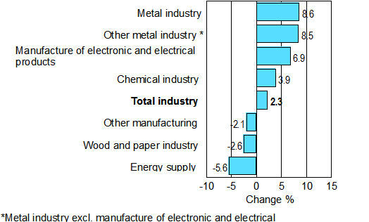 According to Statistics Finland, industrial output adjusted to working days was 2.3 per cent higher in January 2008 than twelve months earlier. In January output grew the most in the metal industry. Its growth amounted to 8.6 per cent. In the chemical industry output increased by 3.9 per cent in January. Output declined most, by 5.6 per cent, in energy supply. In the wood and paper industry output in January was 2.6 per cent down on the previous year. In other manufacturing output decreased by 2.1 per cent.
