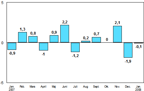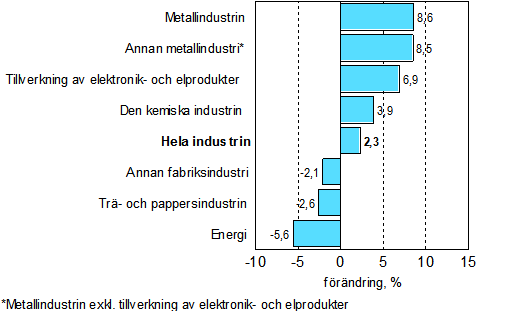 Enligt Statistikcentralen var den arbetsdagskorrigerade industriproduktionen 2,3 procent större i januari 2008 än året innan. I januari ökade produktionen mest inom metallindustrin. Ökningen var 8,6 procent. Produktionen inom den kemiska industrin steg i januari med 3,9 procent. Produktionen minskade mest inom energiförsörjning, med 5,6 procent. Inom trä- och pappersindustrin sjönk produktionen i januari med 2,6 procent från året innan. Också produktionen inom den övriga fabriksindustrin sjönk med 2,1 procent.