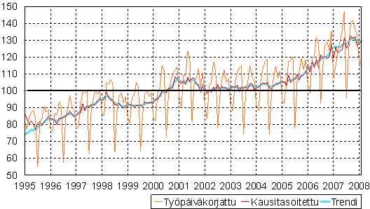 teollisuustuotannon volyymi-indeksi 1995 - 2008 helmikuu,