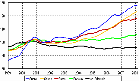 Teollisuustuotannon trendi 1999-2008, (Suomi, Saksa, Ruotsi, Ranska ja Iso-Britannia), 2000=100