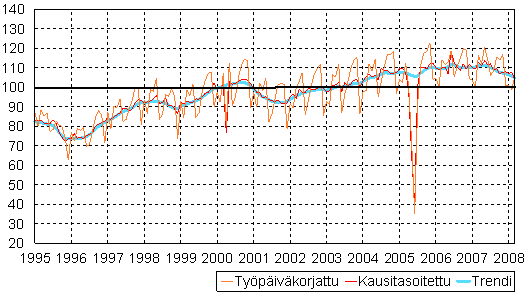 teollisuustuotannon volyymi-indeksi 1995 - 2008 maaliskuu,