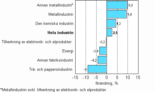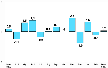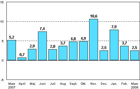 Enligt Statistikcentralen var den arbetsdagskorrigerade industriproduktionen 2,5 procent större i mars 2008 än året innan. Övrig metallindustri ökade mest i mars. Produktionen gick upp med 9,9 procent. Produktionen inom den kemiska industrin ökade med 4,3 procent. Tillverkning av elektronik- och elprodukter gick ned med 0,3 procent i mars. Produktionen inom den övriga fabriksindustrin minskade med 4,2 procent. Mest minskade produktionen inom trä- och pappersindustrin, med 9 procent.