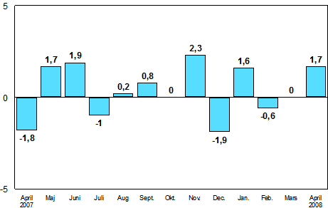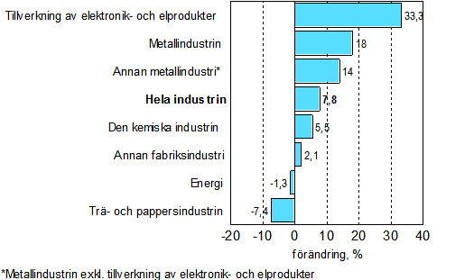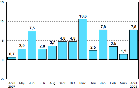 Enligt Statistikcentralen var den arbetsdagskorrigerade industriproduktionen 7,8 procent större i april 2008 än året innan. Tillverkningen av elektronik- och elprodukter ökade mest i april. Produktionen gick upp med 33,3 procent. Den övriga metallindustrin ökade alltjämt också kraftigt. Produktionen inom den övriga metallindustrin ökade med 14 procent. Produktionen inom den kemiska industrin ökade med 5,5 procent. Mest minskade produktionen inom trä- och pappersindustrin, dvs. med 7,4 procent.