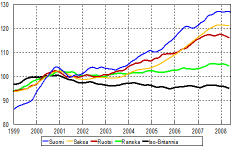 Teollisuustuotannon trendi 1999-2008, (Suomi, Saksa, Ruotsi, Ranska ja Iso-Britannia), 2000=100