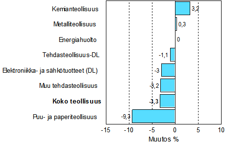 Teollisuuden työpäiväkorjattu tuotanto oli Tilastokeskuksen mukaan vuoden 2008 kesäkuussa 3,3 prosenttia pienempi kuin vuotta aikaisemmin. Tammi-kesäkuussa työpäiväkorjattu teollisuustuotanto kasvoi 3 prosenttia vuoden takaisesta. Teollisuustuotannon pitkään jatkunut kasvu pysähtyi. Puu- ja paperiteollisuuden tuotanto väheni kesäkuussa 9,3 prosenttia. Elektroniikka- ja sähkötuotteiden valmistuksen alkuvuoden vahva kasvu kääntyi 3 prosentin laskuksi kesäkuussa. Muun tehdasteollisuuden tuotanto laski 3,2 prosenttia. Sateinen kesäkuu vaikeutti turpeen tuotantoa, joka laski 45,2 prosenttia. Kemianteollisuuden tuotanto kasvoi kesäkuussa 3,2 prosenttia.