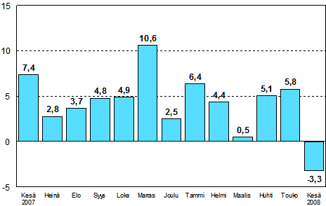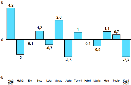 - Teollisuustuotannon kausitasoitettu muutosprosentti toukokuu 2008 / kesäkuu 2008 (31.7.2008)