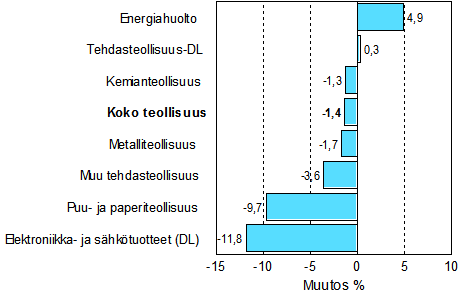 Teollisuuden työpäiväkorjattu tuotanto oli Tilastokeskuksen mukaan vuoden 2008 heinäkuussa 1,4 prosenttia pienempi kuin vuotta aikaisemmin. Tammi-heinäkuussa työpäiväkorjattu teollisuustuotanto kasvoi 2,4 prosenttia vuoden takaisesta. Teollisuustuotannon pitkään jatkunut kasvu pysähtyi. Päätoimialoista kasvoi vain energiahuolto. Elektroniikka- ja sähkötuotteiden valmistus väheni heinäkuussa 11,8 prosenttia. Puu- ja paperiteollisuuden tuotanto väheni heinäkuussa 9,7 prosenttia. Muun tehdasteollisuuden tuotanto laski 3,6 prosenttia. Kemianteollisuuden tuotanto väheni heinäkuussa 1,3 prosenttia.
