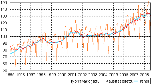 teollisuustuotannon volyymi-indeksi 1995 - 2008 elokuu,