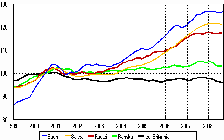 Teollisuustuotannon trendi 1999-2008, (Suomi, Saksa, Ruotsi, Ranska ja Iso-Britannia), 2000=100