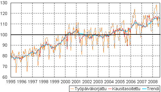teollisuustuotannon volyymi-indeksi 1995 - 2008 syyskuu,