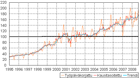 teollisuustuotannon volyymi-indeksi 1995 - 2008 syyskuu,