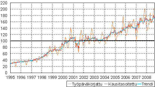 teollisuustuotannon volyymi-indeksi 1995 - 2008 lokakuu,