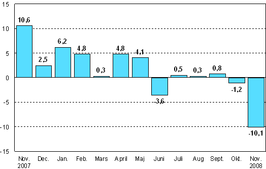 Enligt Statistikcentralen var den arbetsdagskorrigerade industriproduktionen 10,1 procent mindre i november 2008 än året innan. Den arbetsdagskorrigerade industriproduktionen ökade under januari-november med bara 0,3 procent från året innan. Jämfört med motsvarande period året innan har ökningen avtagit med drygt fyra procentenheter.