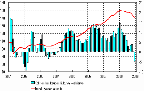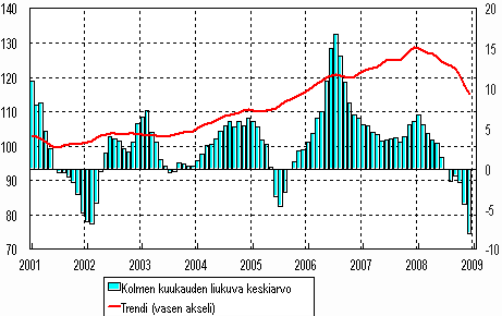 Teollisuustuotannon trendi on niin Suomessa kuin muissakin Suomen kannalta tärkeissä vientimaissa voimakkaassa laskussa. Suomessa teollisuustuotannon huippu saavutettiin vuoden 2008 alussa ja siitä se on tullut varsin jyrkästi alas. Samanlainen kehitys on myös Suomen viennin kannalta tärkeissä EU-maissa.