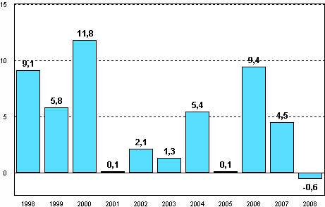 Vuoden 2008 neljännellä vuosineljänneksellä teollisuustuotanto oli Tilastokeskuksen ennakkotietojen perusteella 8 prosenttia pienempi kuin vuoden 2007 vastaavana ajankohtana. Teollisuustuotanto koki viime vuoden lopulla lähihistorian pahimman notkahduksen.