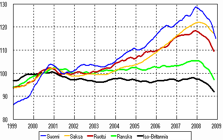Teollisuustuotannon trendi 1999-2008, (Suomi, Saksa, Ruotsi, Ranska ja Iso-Britannia), 2000=100