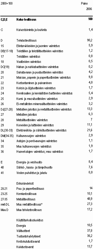 Ohessa teollisuustuotannon volyymi-indeksin julkaisutoimialat ja jalostusarvo-osuudet. Toimialoittaisina painoina käytetään vuonna 2008 vuoden 2006 jalostusarvoja.