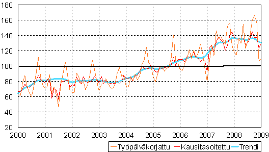 teollisuustuotannon volyymi-indeksi 2000 - 2009 tammikuu, 2005=100,