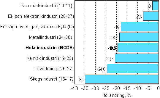 I januari sjönk produktionen inom alla huvudnäringsgrenar. Nedgången blev kraftigare jämfört med december. I januari sjönk produktionen inom metallindustrin med nästan 19 procent. Mest sjönk produktionen inom skogsindustrin, med 35 procent.