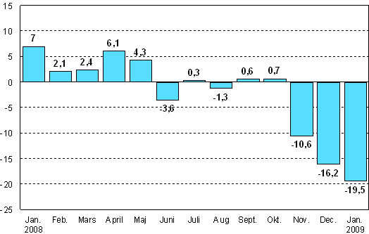 Enligt Statistikcentralen var den arbetsdagskorrigerade industriproduktionen 19,5 procent mindre i januari 2009 än året innan. I december minskade industriproduktionen med drygt 16 procent från året innan. Under november-januari gick industriproduktionens värde ned med drygt 15 procent jämfört med året innan. År 2008 gick industriproduktionen ned med något under en procent. Föregående gång industriproduktionen visade en större minskning var under depressionen år 1991. Då minskade produktionen med rentav 8,7 procent. De senaste månadernas minskning av produktionen har varit kraftigare än under de dystraste tiderna under 1990-talets depression.