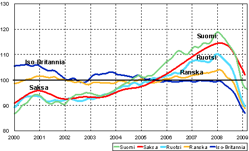 Teollisuustuotannon trendi Suomi (BCDE), Saksa, Ruotsi, Ranska ja Iso-Britannia (BCD) 2000 - 2009, 2005=100, TOL 2008
