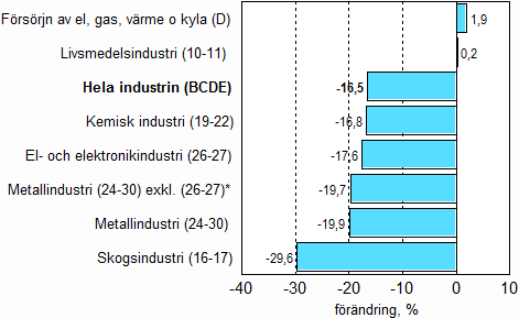 I mars sjönk produktionen inom de flesta huvudnäringsgrenar ytterligare. Produktionen inom den kemiska industrin minskade med något under 17 procent. Produktionen inom el- och elektronikindustrin sjönk i mars med något under 18 procent från året innan. Produktionen inom metallindustrin sjönk med nästan 20 procent. Mest sjönk produktionen inom skogsindustrin, med 30 procent. Produktionen inom livsmedelsindustrin verkar vara den första som gått in i en tillväxtbana. Dess produktion ökade i mars med 0,2 procent.