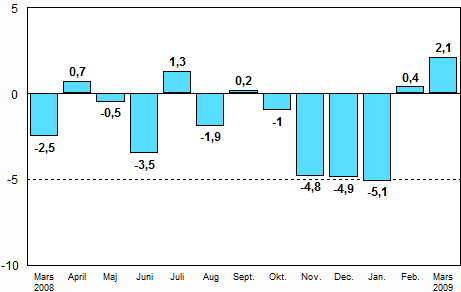 Enligt Statistikcentralen var den arbetsdagskorrigerade industriproduktionen 16,5 procent mindre i mars 2009 än året innan. I februari minskade industriproduktionen med 21,5 procent från året innan. Under januari-mars har industriproduktionen minskat med drygt 20 procent jämfört med året innan.