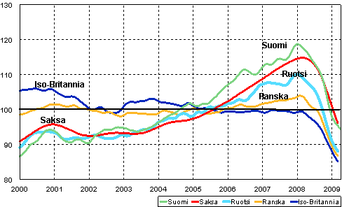 Teollisuustuotannon trendi Suomi (BCDE), Saksa, Ruotsi, Ranska ja Iso-Britannia (BCD) 2000 - 2009, 2005=100, TOL 2008