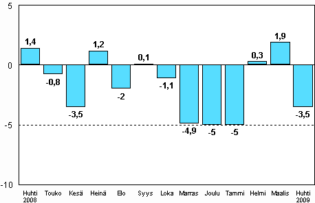 Koko teollisuuden (BCDE) työpäiväkorjattu tuotanto oli Tilastokeskuksen mukaan vuoden 2009 huhtikuussa 21 prosenttia pienempi kuin vuotta aikaisemmin. Maaliskuussa teollisuustuotanto väheni 16,6 prosenttia vuoden takaisesta. Tammi-huhtikuussa teollisuustuotanto on vähentynyt vajaat 21 prosenttia viime vuoden vastaavasta ajankohdasta.