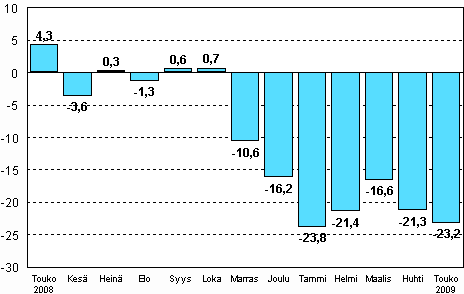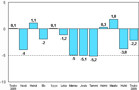 Koko teollisuuden (BCDE) työpäiväkorjattu tuotanto oli Tilastokeskuksen mukaan vuoden 2009 toukokuussa 23,2 prosenttia pienempi kuin vuotta aikaisemmin. Huhtikuussa teollisuustuotanto väheni 21,3 prosenttia vuoden takaisesta. Tammi-toukokuussa teollisuustuotanto on vähentynyt vajaat 22 prosenttia viime vuoden vastaavasta ajankohdasta.