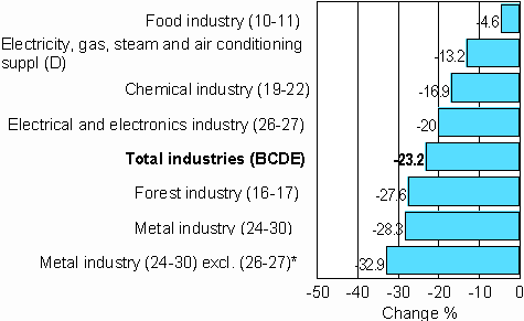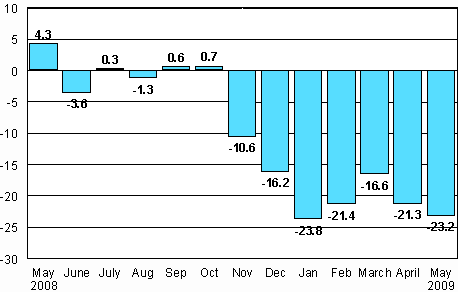 According to Statistics Finland, the working-day adjusted output of total industries (BCDE) was 23.2 per cent lower in May 2009 than twelve months earlier. In April industrial output decreased by 21.3 per cent year-on-year. In the January to May period, industrial output decreased by close on 22 per cent from the corresponding period in the year before.