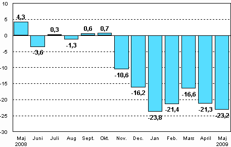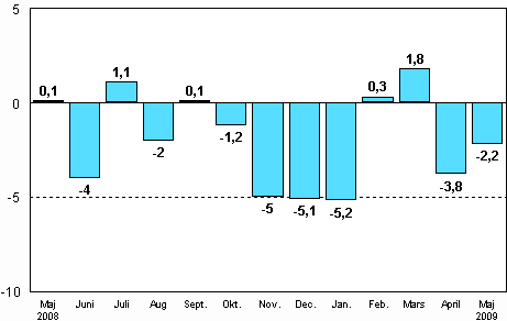 Enligt Statistikcentralen var den arbetsdagskorrigerade produktionen för hela industrin (BCDE) 23,2 procent mindre i maj 2009 än året innan. I april minskade industriproduktionen med 21,3 procent från året innan. Under januari-maj har industriproduktionen minskat med något under 22 procent jämfört med motsvarande period året innan.