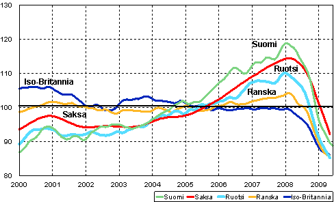 Teollisuustuotannon trendi Suomi (BCDE), Saksa, Ruotsi, Ranska ja Iso-Britannia (BCD) 2000 - 2009, 2005=100, TOL 2008