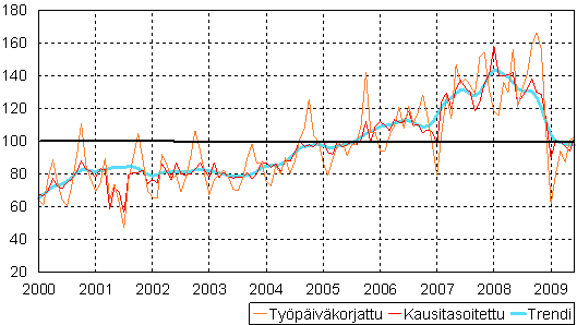 teollisuustuotannon volyymi-indeksi 2000 - 2009 kesäkuu, 2005=100,
